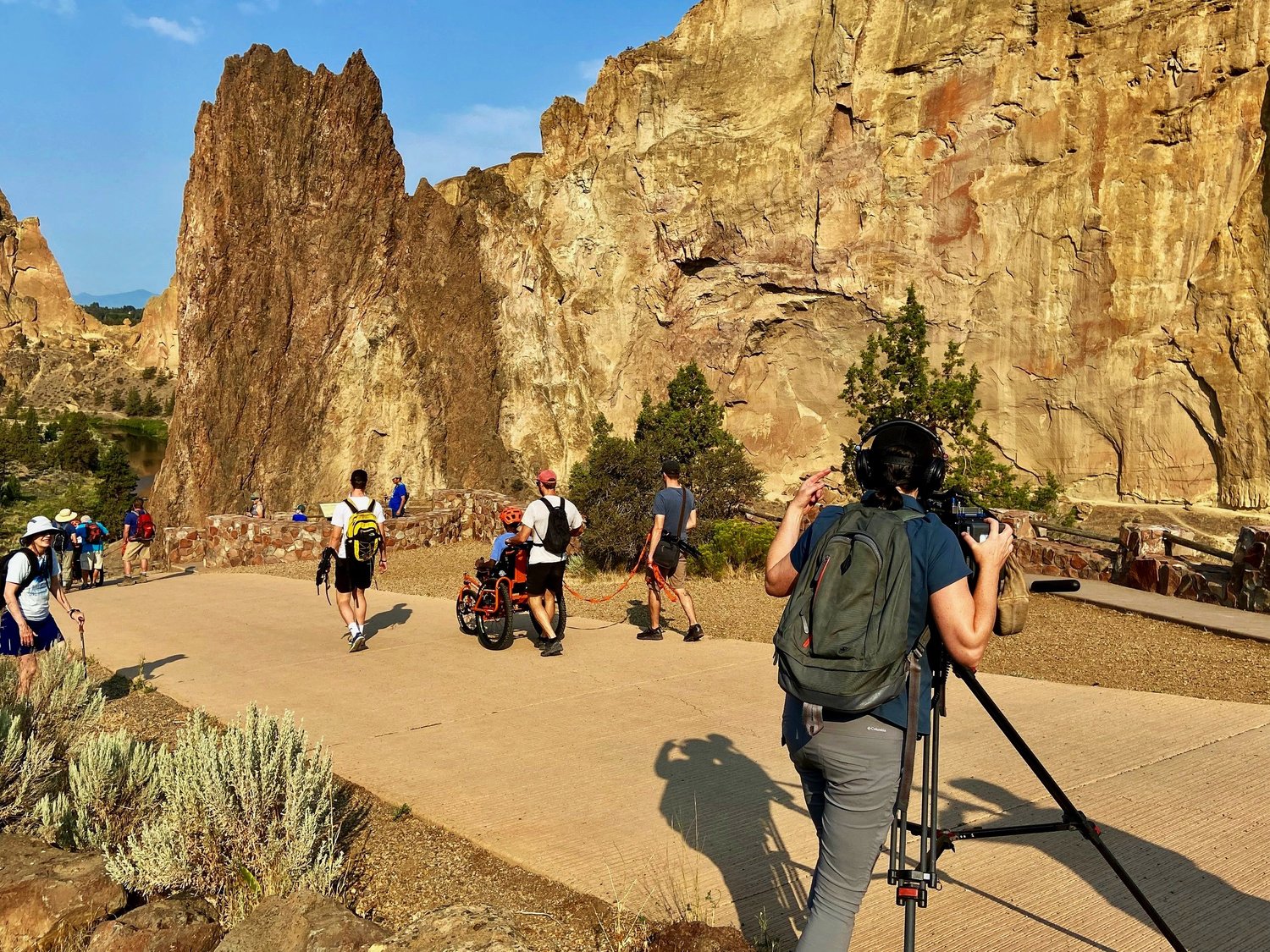 A weekly TV news magazine exploring the ecological issues, natural wonders, and outdoor recreation of the Northwest for over 30 years, OPB’s Oregon Field Guide has been coming to Smith Rock State Park to cover a range of stories, from rock climbing to geology. This time they needed to add oppressive weather to the logistics of filming mobility challenged subjects navigating conditions that can pose an issue to a lot of visitors to the park.
