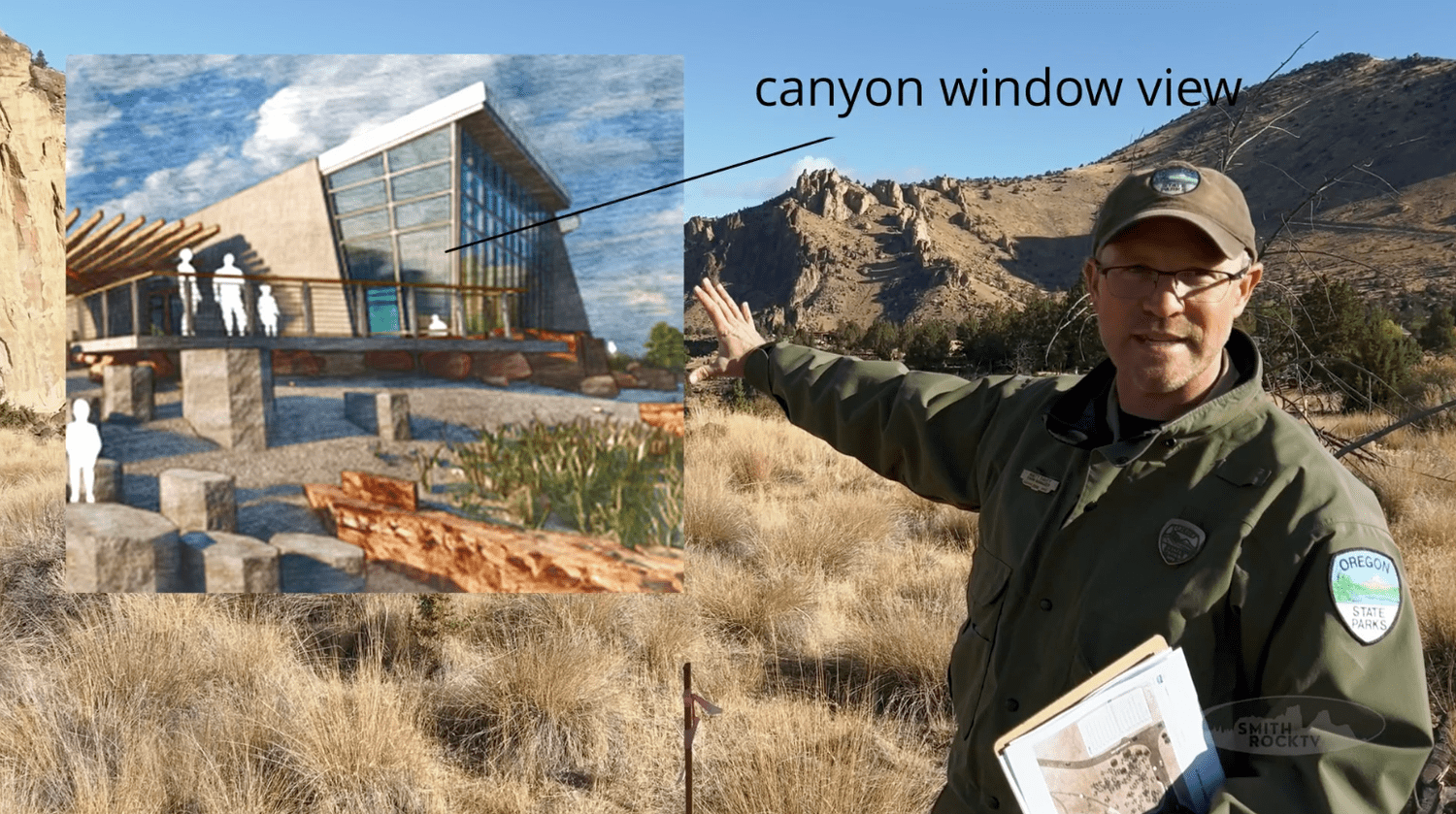The main building of the new Smith Rock Visitor Center will provide great views along with interpretative panels and a greeting area. Click to enlarge.