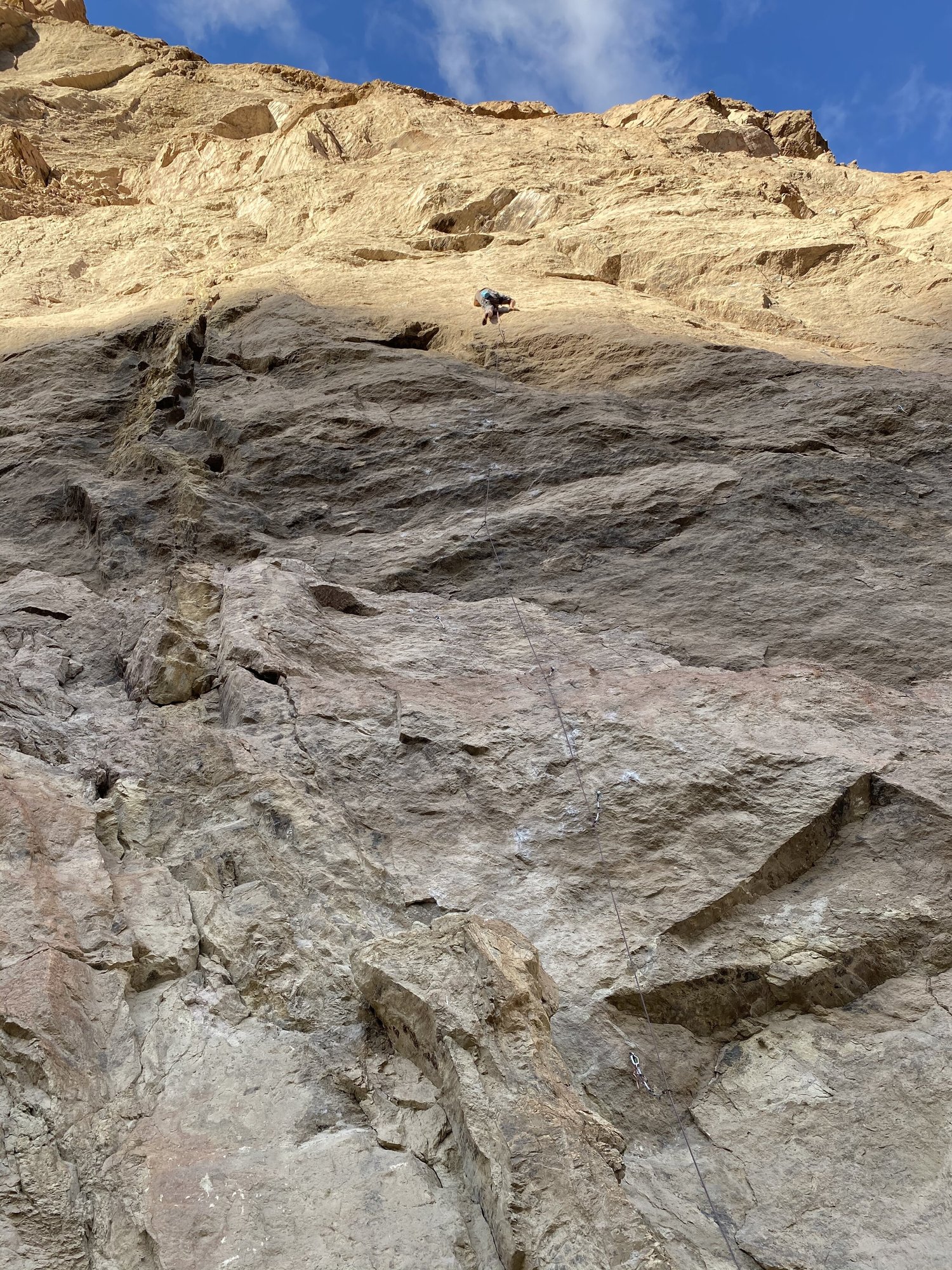 Starting out the climb, you’re met with a bouldery section down low. A good benchmark to see how my back was fairing. Carefully setting up, I stabbed up and stuck the first hard move. To my pleasant surprise after doing the boulder problem and mantling up with no pain, I pushed onward to the next hard section above. As I was making moves through the beginning sequence, everything felt really good. Setting up on a sharp side pull and opposite thumber-cling, I stabbed to the next hold high above my head. After momentarily sticking the move, I fell without feeling any unwarranted pain. Sweet, I’m back! After trying the lower crux sections a few times, I pulled through them to try my hand on the exposed slab above. I climbed through the unnerving sections with eager excitement managing to get to the anchors of my near 40-meter project; even learning some new beta along the way.
